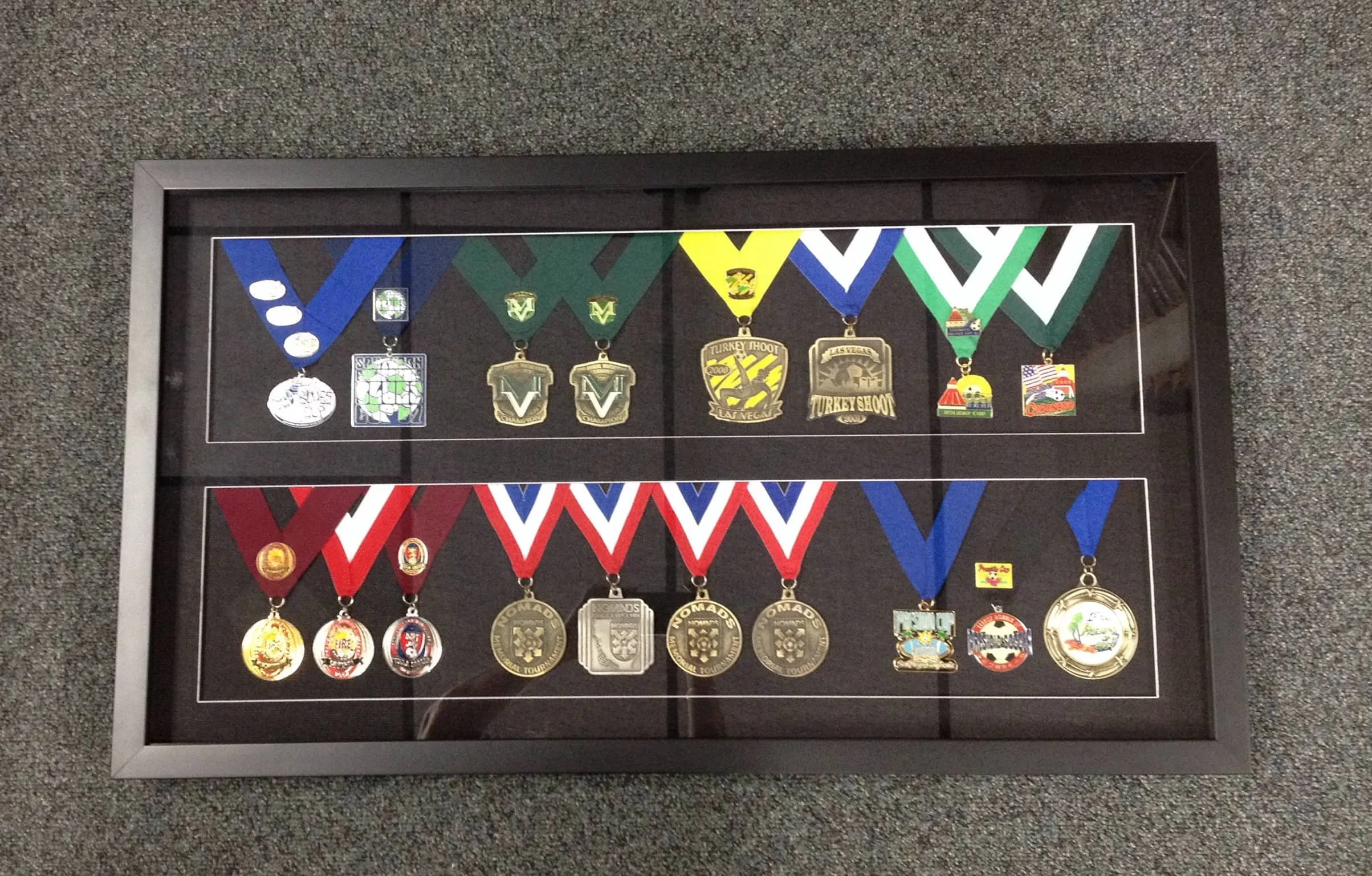 Each medal or pin is mounted individually to maintain alignment and reduce strain over time.